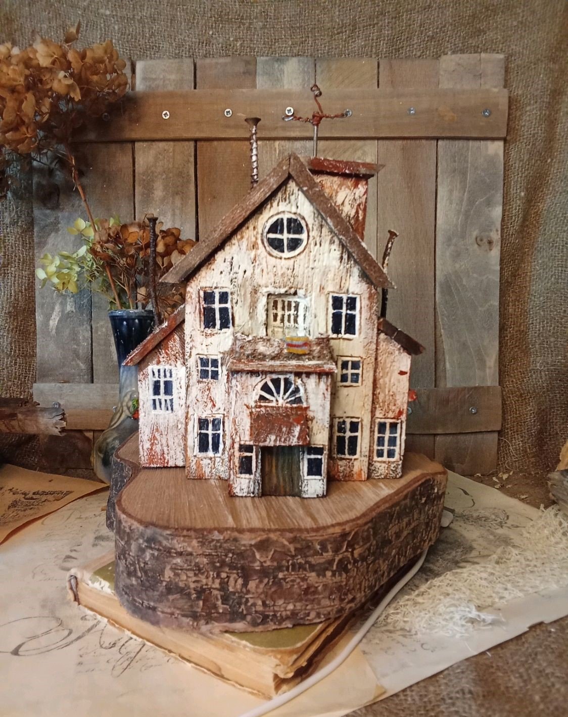 Materials: Natural wood, acrylic paints, chalk paint, acrylic varnish, ground coffee, metal, linen