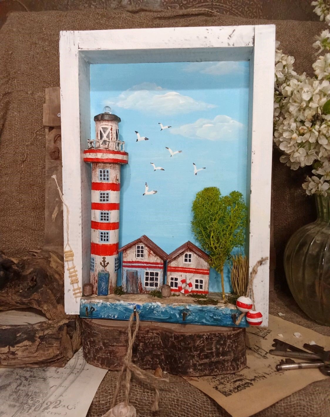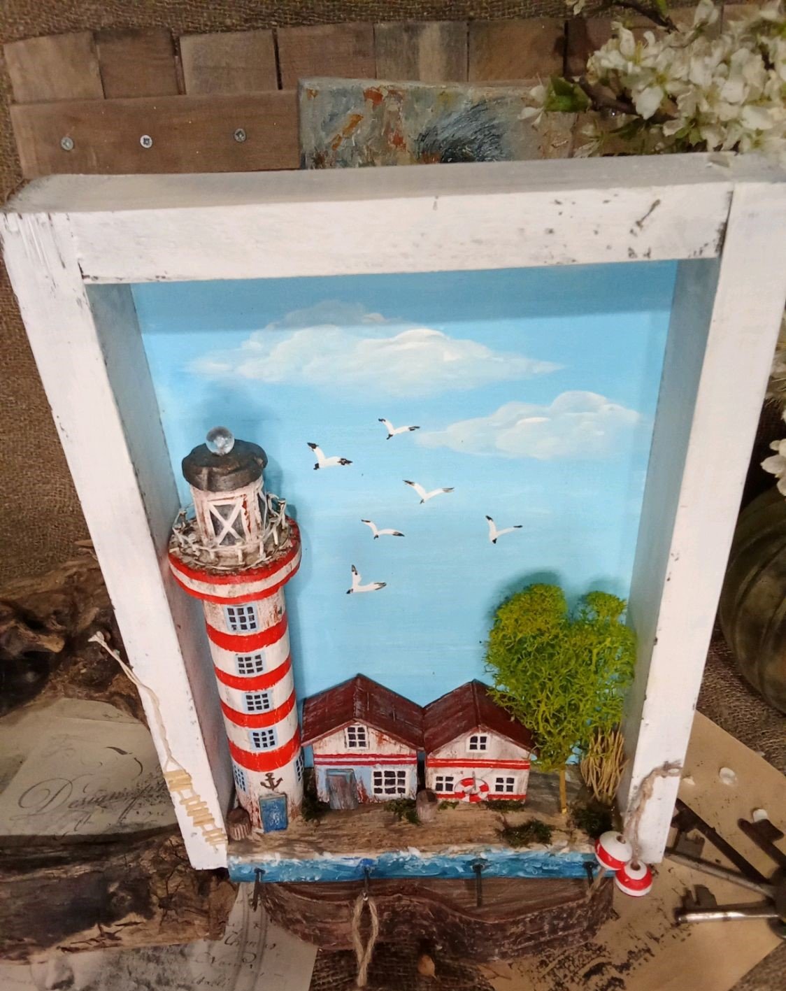 Materials: wood, metal, acrylic paints, acrylic varnish, chalk paints, stabilized moss, shells, pine needles, canvas on cardboard
